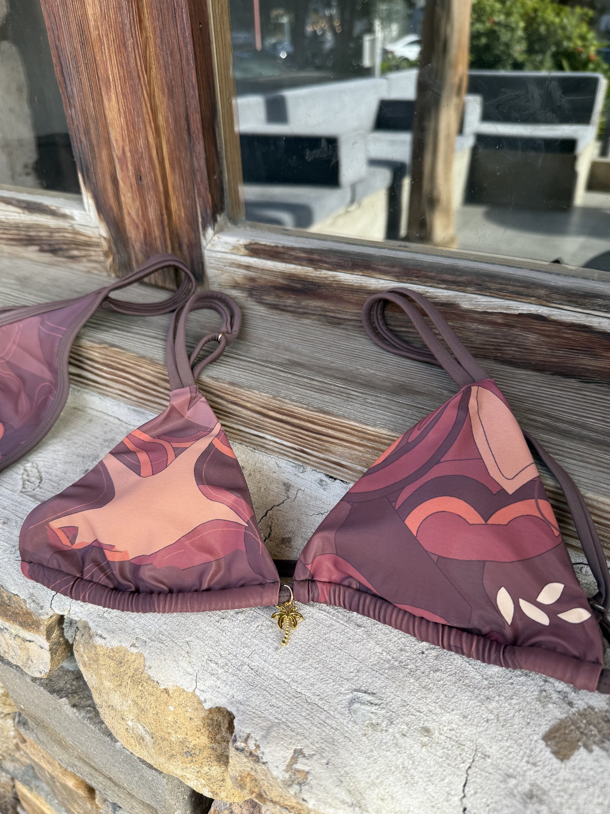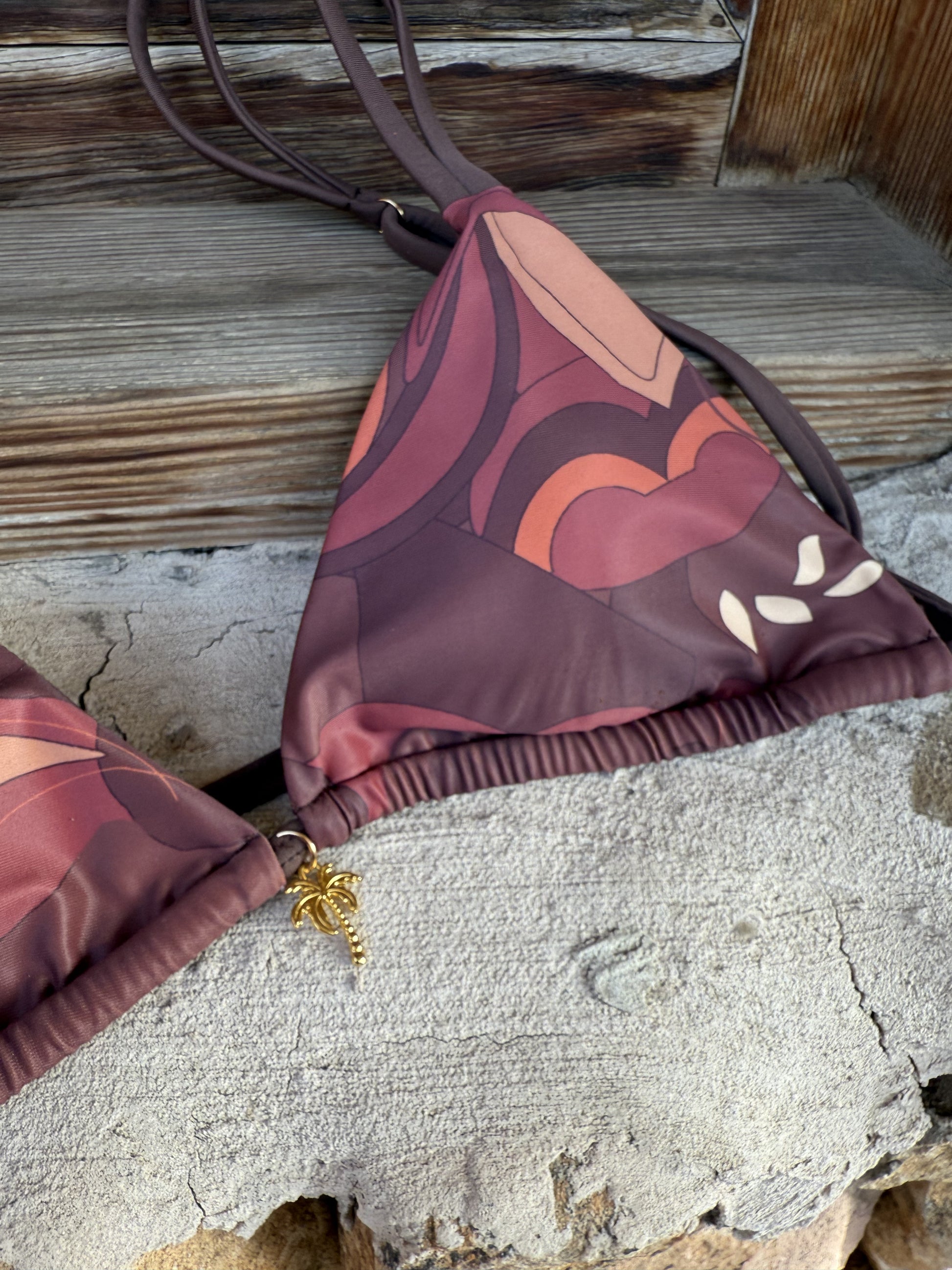 بكيني بني قطعتين بتصميم أنيق وجريء، الجزء العلوي بقصة كلاسيكية والجزء السفلي بحزام جانبي مميز، مثالي للشاطئ والمسبح.