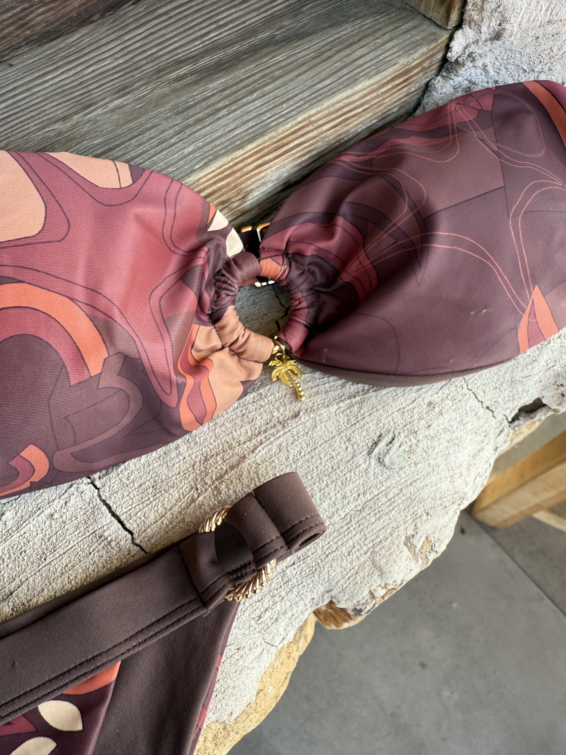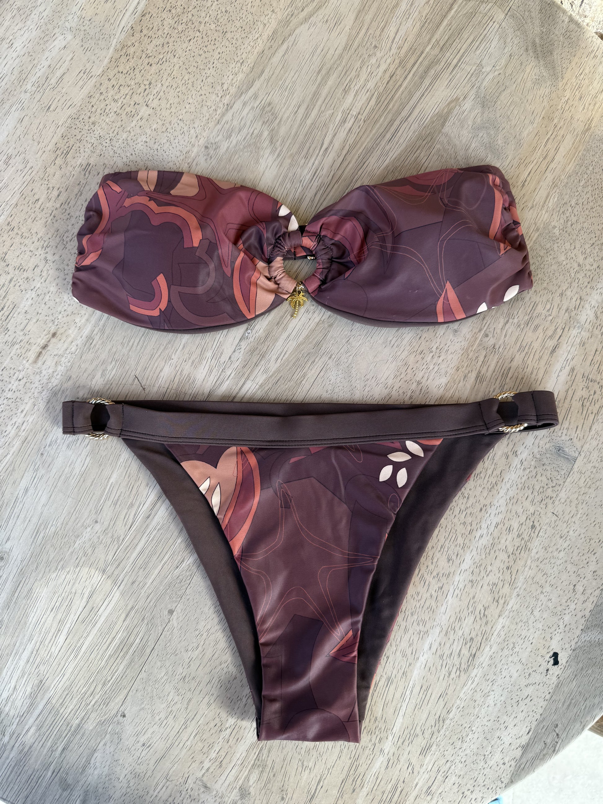 بكيني قطعتين بتصميم أنيق: القطعة العلوية سترابليس بحلقة وسط مميزة، والقطعة السفلية بحزام جانبي مع حلقة ديكورية. خامة مريحة وعالية الجودة.